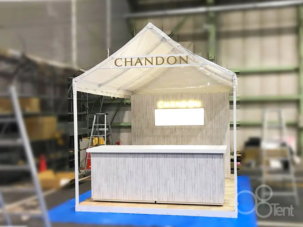 組み立てテントの施工詳細 イベントブース用として、組み立てテントをオーダーメイドにて製作いたしました。 正面(妻面)や側面は透明のシートを取り付けてあります。屋外で使用する際に雨よけ・風よけとして活用できます。