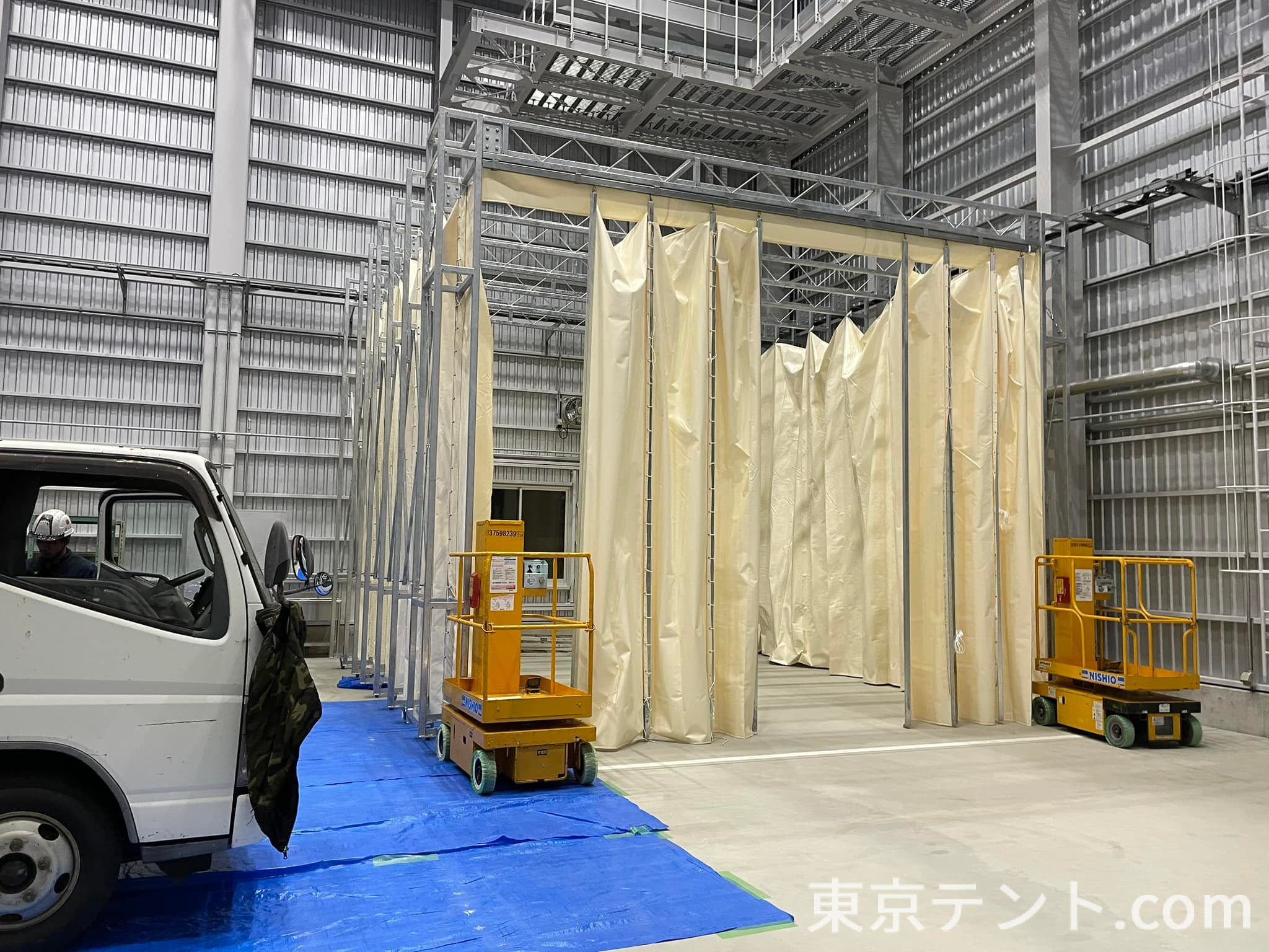 キャスターテントを工場内に施工 2025年5月5日 最終更新日時 : 2025年3月4日 08adminキャスターテントの施工詳細キャスターテントを工場内に施工いたしました。キャスターテント・可動式テント倉庫についてキャスターテント・可動式テント倉庫とは、キャスター付きで自由に移動可能な小型倉庫です。openclosed各支柱にキャスターがついているので、写真のように簡単に移動することが可能です。また、固定したいエリアには、アンカー&チェーンをつけることで、移動することもなく安心してご使用いただけます!