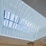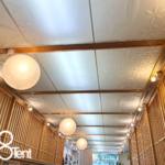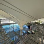 特殊メッシュで制作した天井膜をオフィスに施工 2025年9月15日 最終更新日時 : 2025年5月22日 08admin天井膜の施工詳細特殊メッシュで制作した天井膜を、オフィスに施工させていただきました。天井に張られた08メッシュの天幕には、企業ポリシーを表現する花のパターンを施しました。両脇に会議室を設置した階段状の「ステージ」。弊社が手掛けた天井に張られた天井膜は、立体的な花のパターンを形状記憶させた特殊メッシュ(08メッシュ)を使用しています。