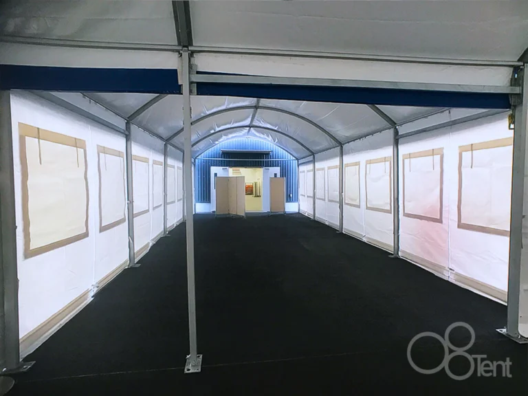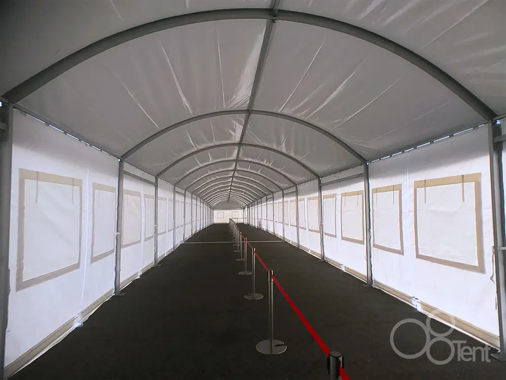 テントはアーチ型の屋根と密閉性の高い側幕構造により、雨風や日差しから乗客を保護。特に直射日光や突然の天候変化にも強い素材を使用しており、快適な待機・検査スペースを確保できます。また、視認性の高いカラーリングを採用することで、初めて訪れる乗客にもゲートの場所が分かりやすく、導線設計の一環としても効果的です。