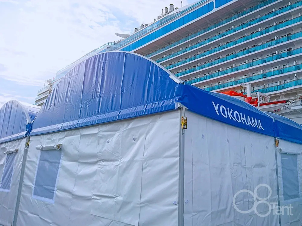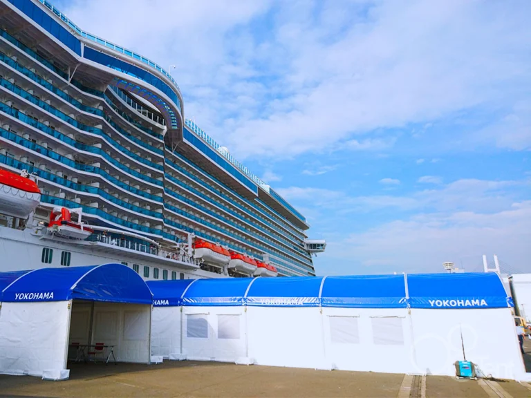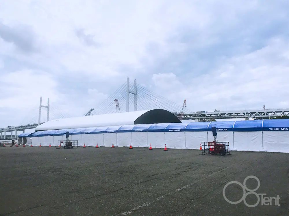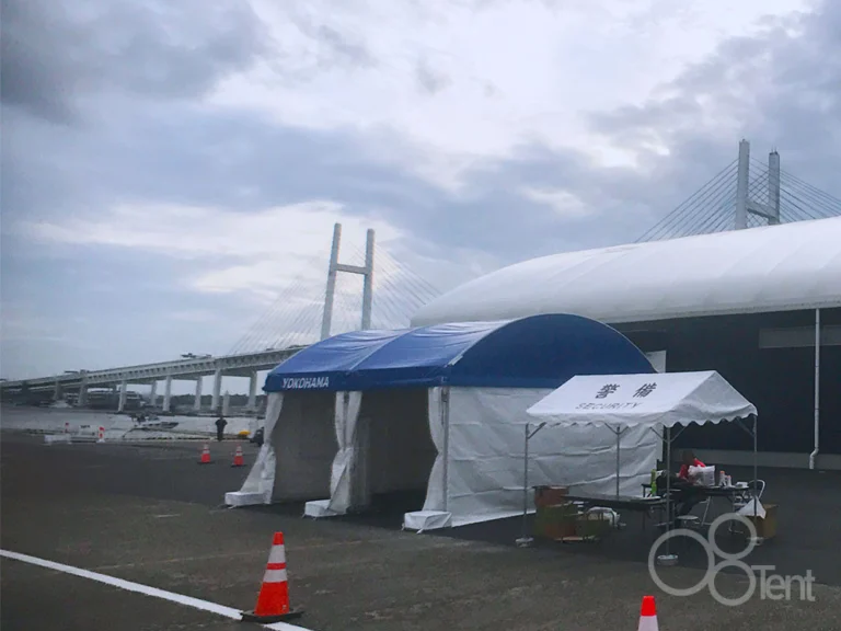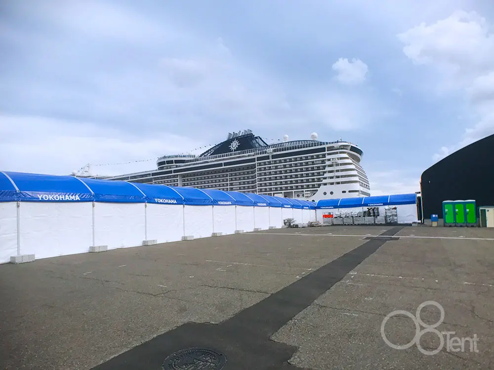 クルーズ船の乗下船時に使用されるターミナルゲートとして、組み立て式の大型テントを施工しました。短期間で設置・撤去が可能な仮設構造ながら、高い耐候性と安定性を兼ね備え、港湾施設での乗客対応をスムーズにサポートします。