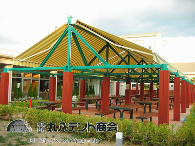「オーニングテント」は、日除けを目的としたテントで、日本で古来より使われてきた、「簾(すだれ)」=オーニング(awning)のことです。また、弊社では、壁等に固定して可動しないものを「庇テント」、可動するものを「オーニングテント」と分類しております。