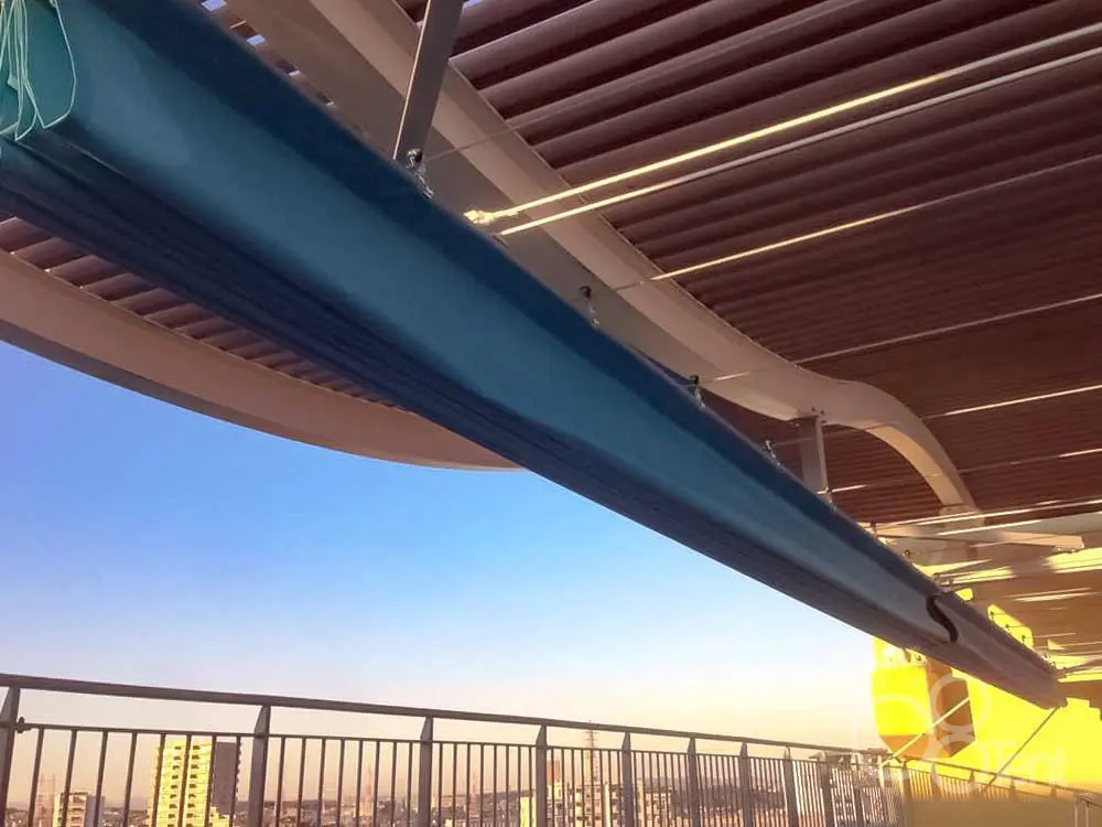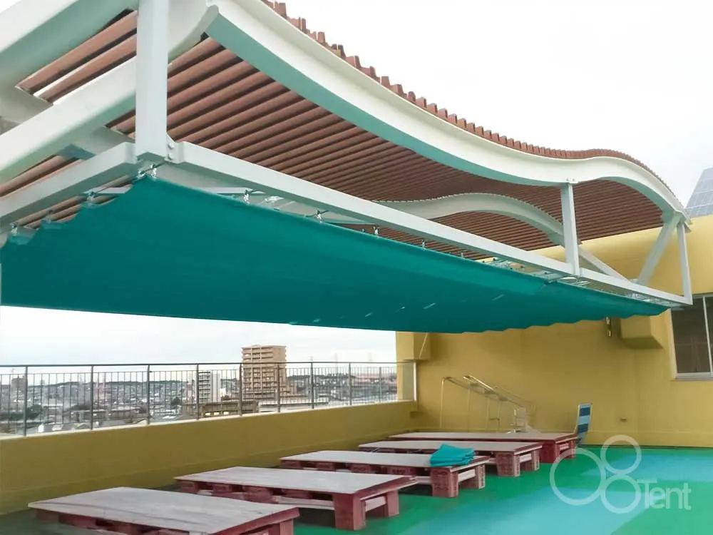 このシェードは、波打つようなデザインとフレームにより、美観を損なわず建物に調和しつつ、広い日陰スペースを確保。開閉機能により、天候や季節に応じて簡単に調節が可能です。晴天時には直射日光を遮り、熱中症リスクの軽減や紫外線対策にも効果を発揮します。また、曇天や風の強い日にはシェードを開けて採光や換気も確保できます。