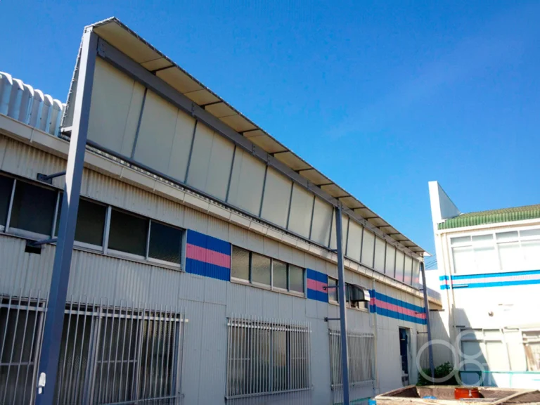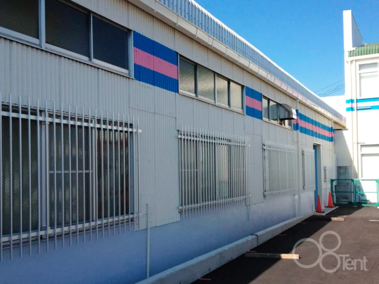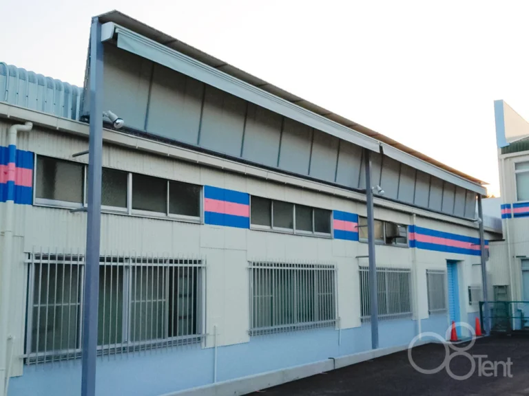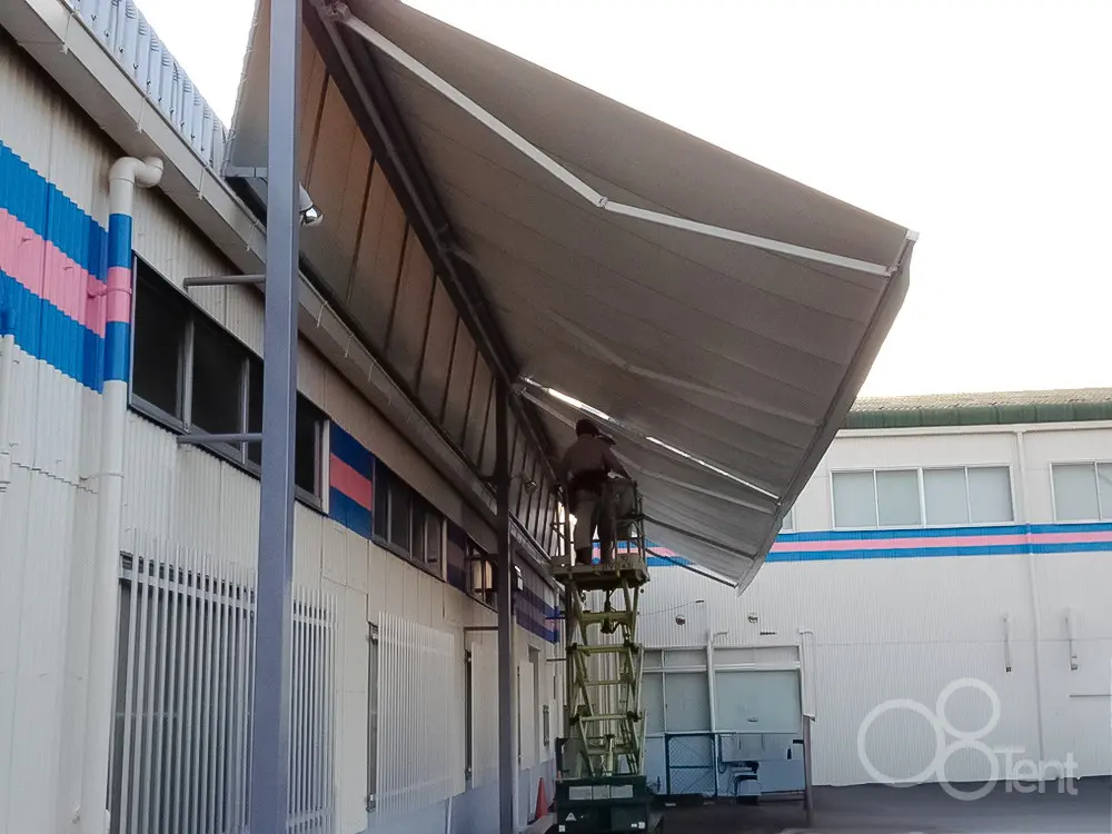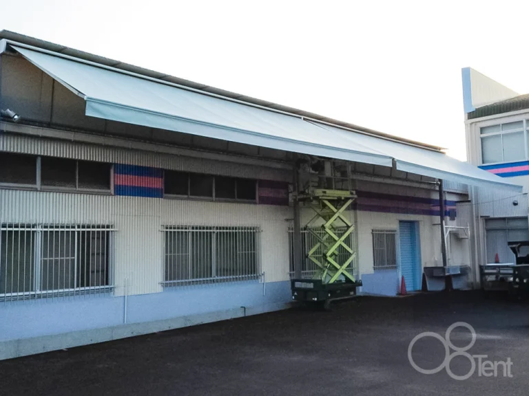 オーニングを法人様の工場・軒先に施工いたしました。幅10m、出幅2mほどの幅広サイズのオーニングです。