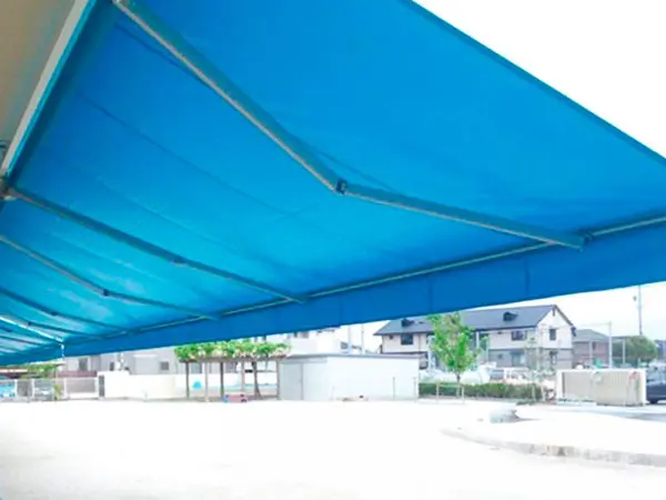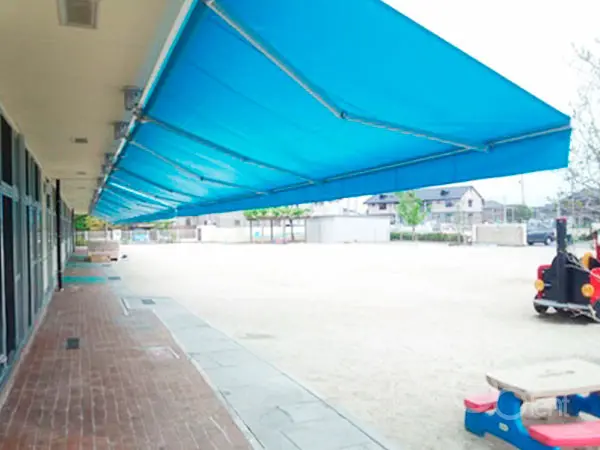 電動オーニングを愛知県の幼稚園に施工いたしました。幅20mの幅広オーニングと、幅10mのオーニング合計3台で安心感のある日かげ・雨よけ空間に仕上がりました。