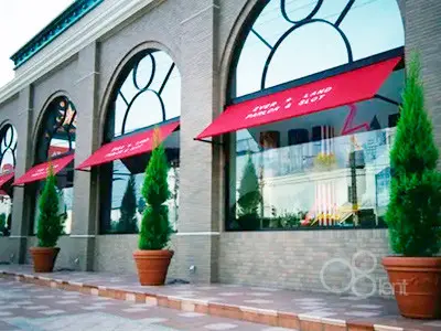 店舗用テントのご紹介です。パネルタイプのすっきりとしたデザインと、落ち着いた赤色が高級感あふれる空間を演出しています。連続して複数施工することで、よりスタイリッシュな空間演出が可能です。