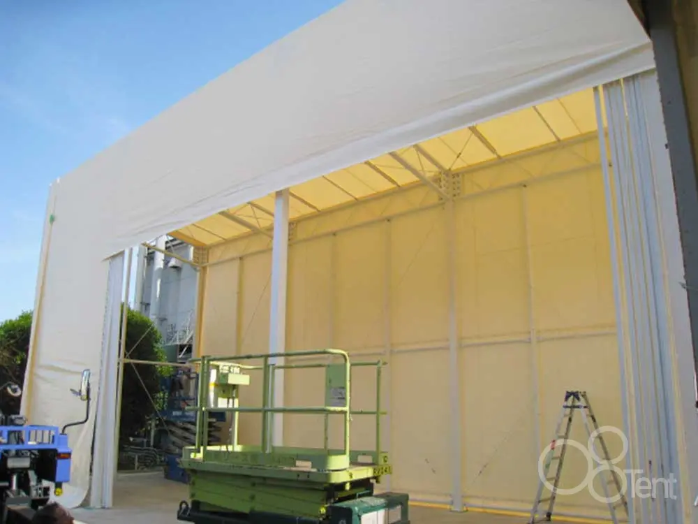 テント倉庫とは、骨組み支持形式の大型テントのうち、倉庫の用途に供されるものを呼びます。テント倉庫の定義は、「主要骨組みに鋼材を使用し、ロープまたは支線などを補助材としたものに、合成繊維または無機繊維の幕材を用いて外構を覆う広報によるテント製倉庫用構造物」とされています。