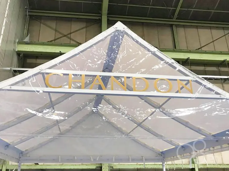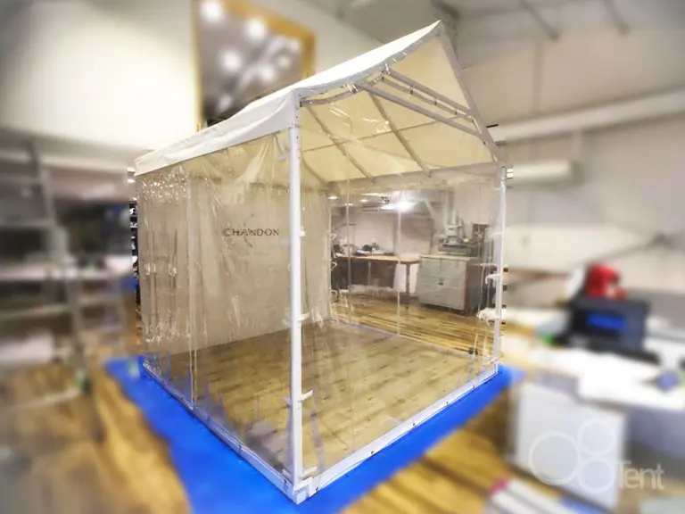イベントブース用の組み立てテント 2025年11月6日 最終更新日時 : 2025年9月10日 08admin組み立てテントの施工詳細イベントブース用として、組み立てテントをオーダーメイドにて製作いたしました。正面(妻面)や側面は透明のシートを取り付けてあります。屋外で使用する際に雨よけ・風よけとして活用できます。