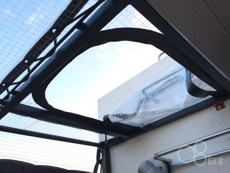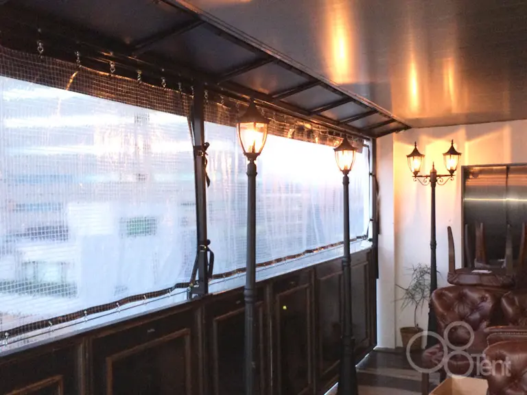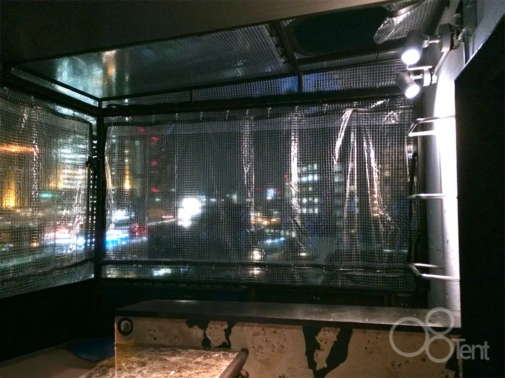 雨天時の雨の吹込みや、冷たい風を防ぐため、開口部を覆うように透明カーテンを取り付けています。