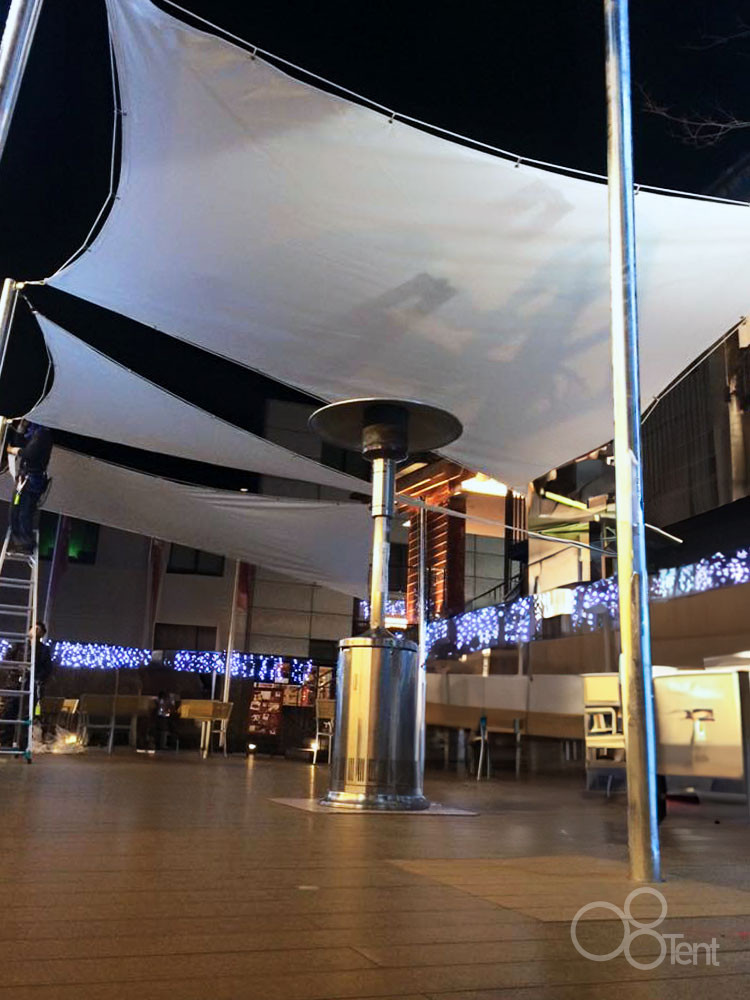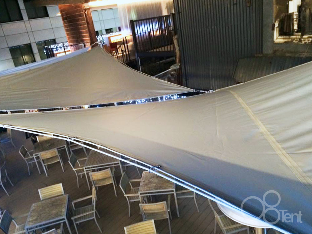フードコートのテラス席へ着脱式タープを施工