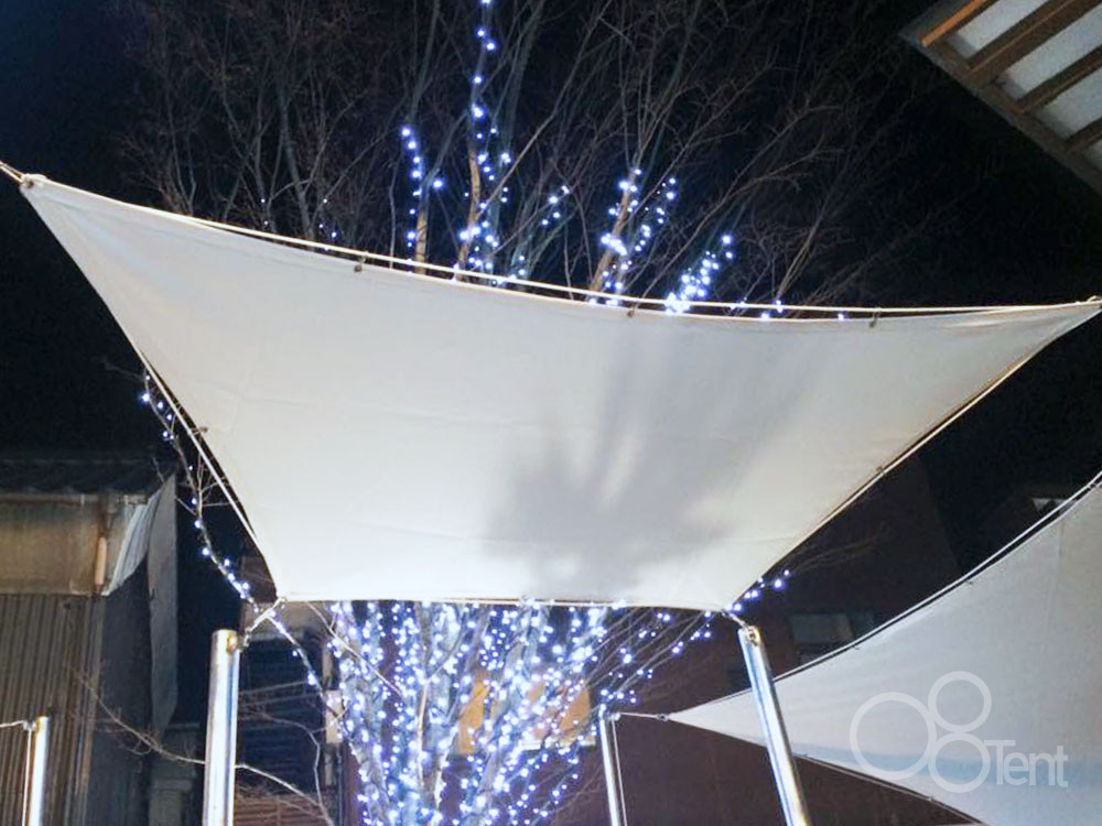 白いタープは照明の光を柔らかく反射するため、夜間のライトアップとの相性が抜群です。画像のようにイルミネーションを施すことで、昼間とは全く違う特別な空間を演出し、夜の集客力アップにも貢献します。