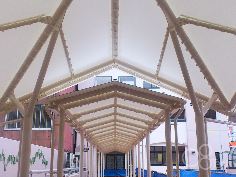 これらの課題に対し、弊社は恒久的な利用に耐えうる、頑丈な通路テント屋根をご提案いたしました。