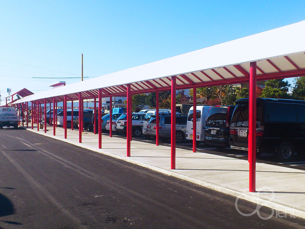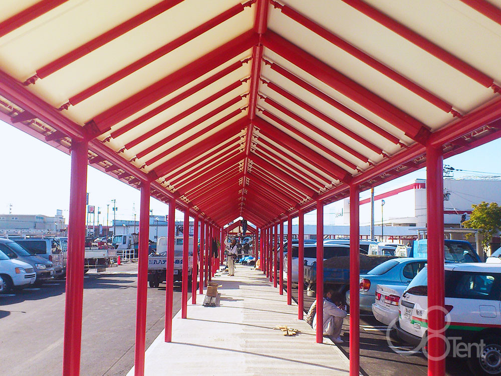 広大な駐車場から施設エントランスまで続くメイン通路に、長尺の通路テント屋根を設置しました。雨の日も、日差しの強い夏の日も、お客様が快適に移動できる動線を確保。鮮やかなレッドのフレームが施設のシンボルとなり、訪れる人々の期待感を高める「おもてなしの道」が完成しました。