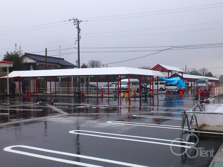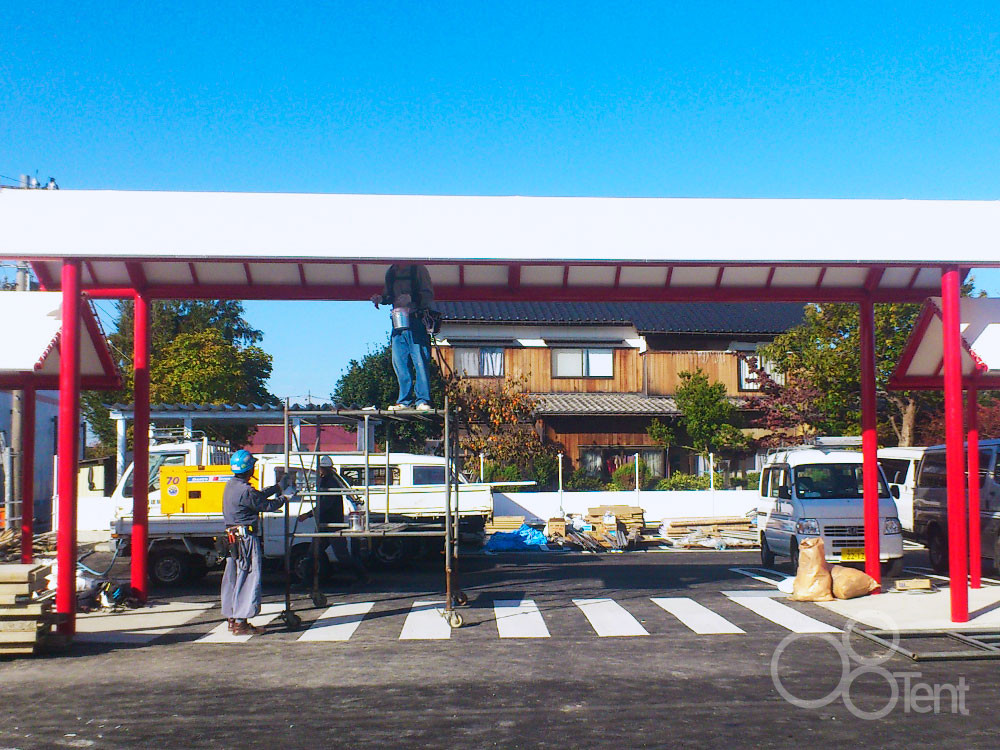 アミューズメント施設の大型駐車場に通路テント屋根を施工