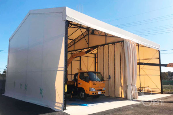 【大型車両・重機車庫】クレーン付きトラックも余裕で格納。高軒高テント倉庫の施工事例新着!!